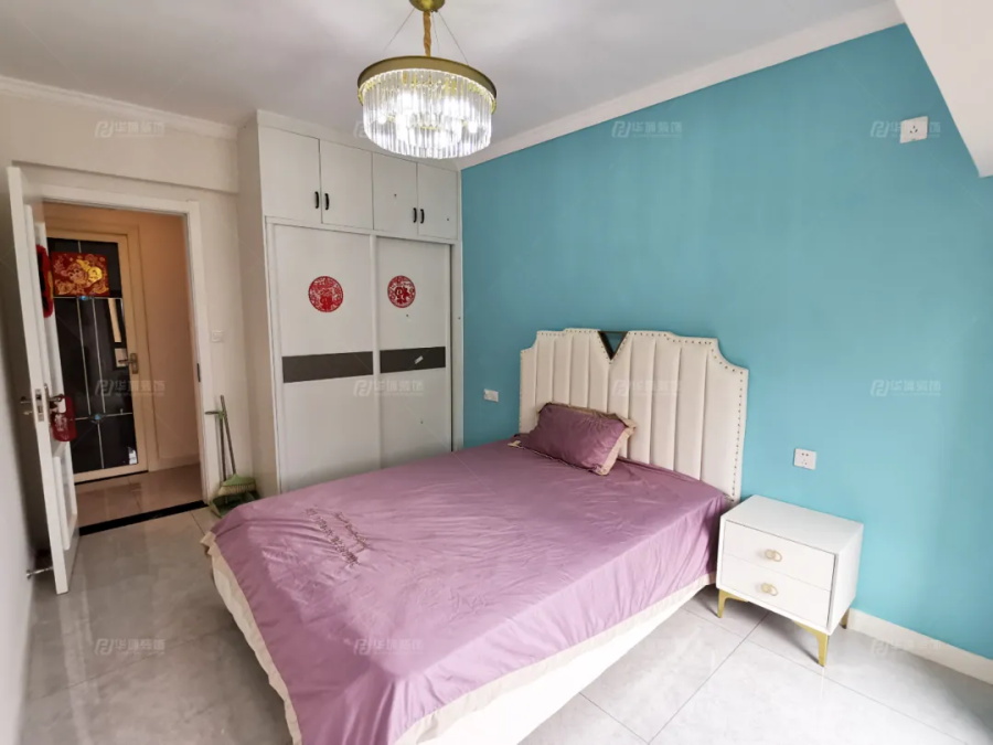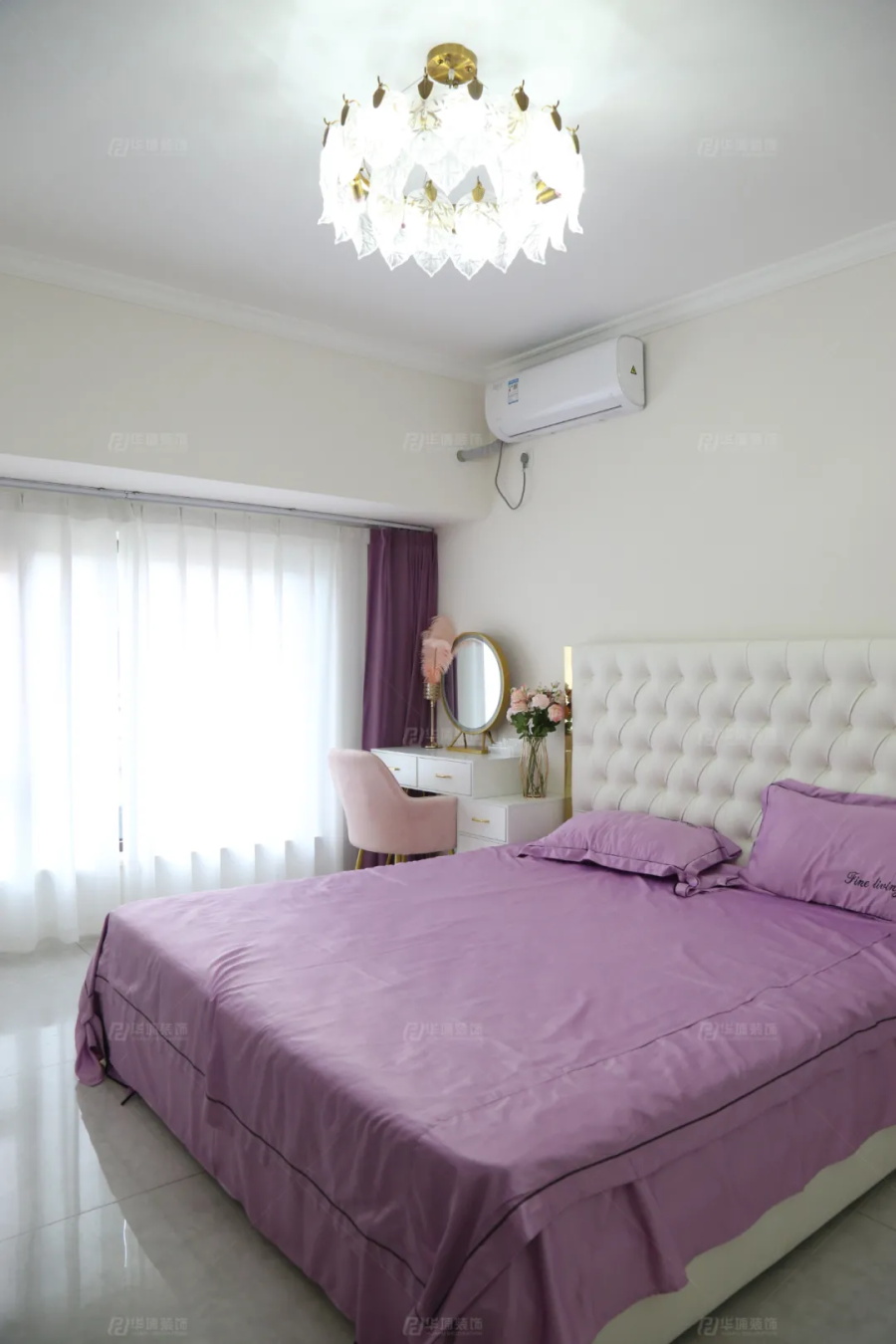主臥用乳白色做空間鋪陳,香芋紫窗簾和床品,茱萸粉化妝凳,通過顏色的對比融合,來營造高貴浪漫的既視感。