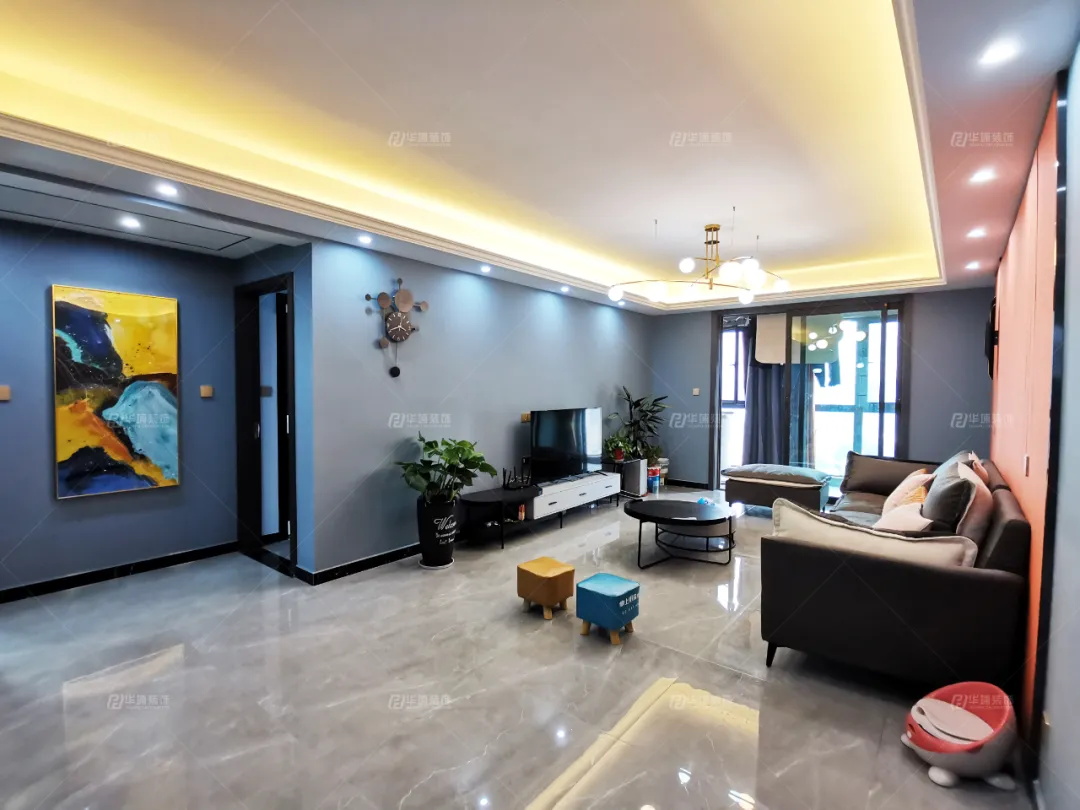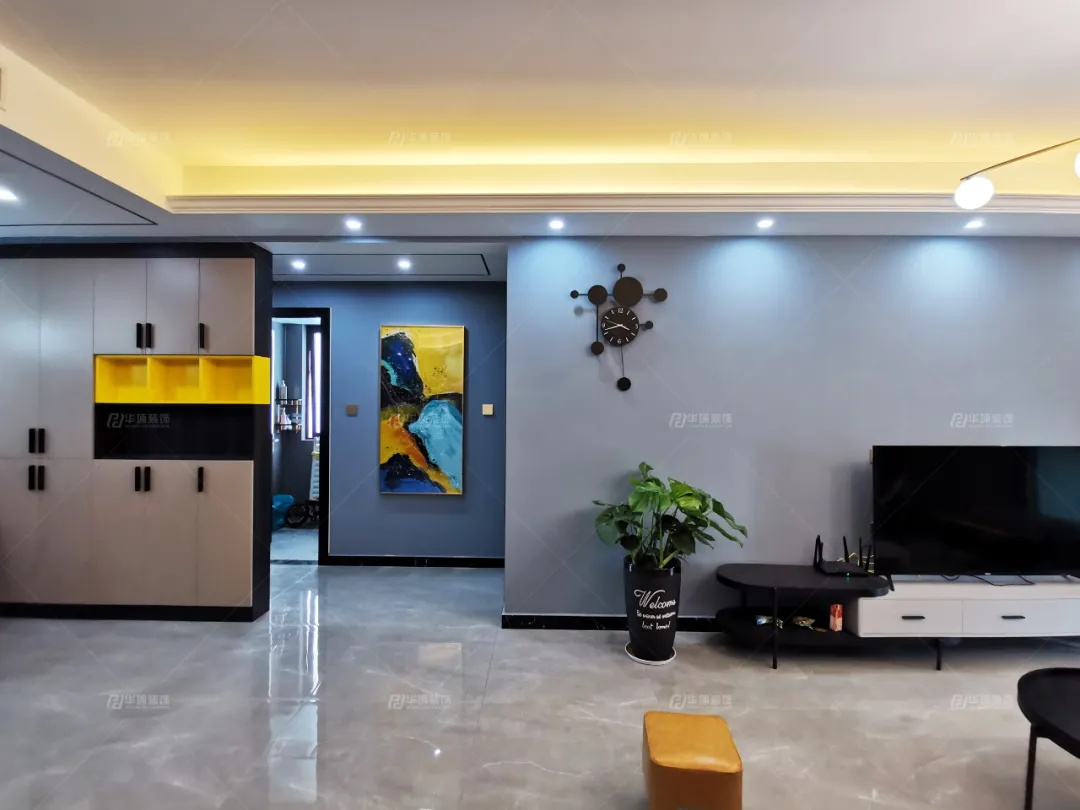 整個(gè)空間的墻面是以藍(lán)色貫穿到底的,通過沙發(fā)背景的愛馬仕橙完成跳躍,冷暖相生相克,讓色彩的魅力以及生活的緊迫感得到了徹底釋放。