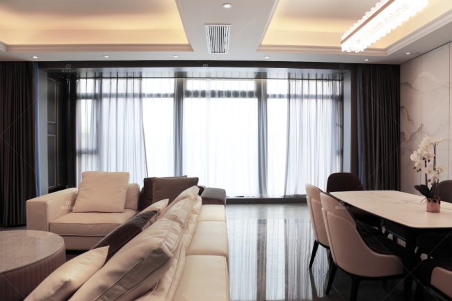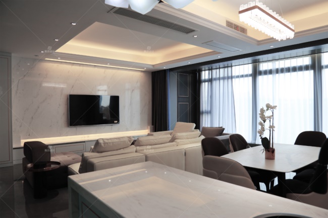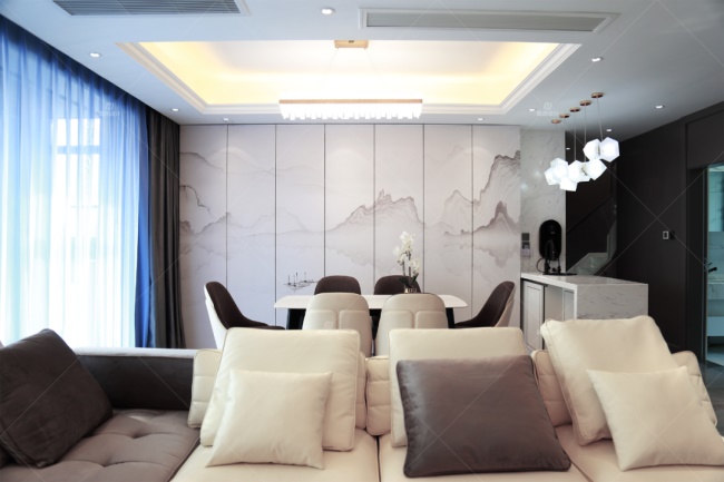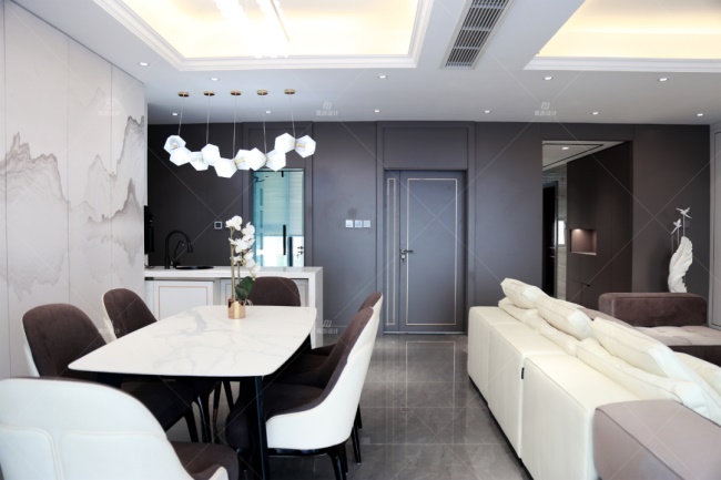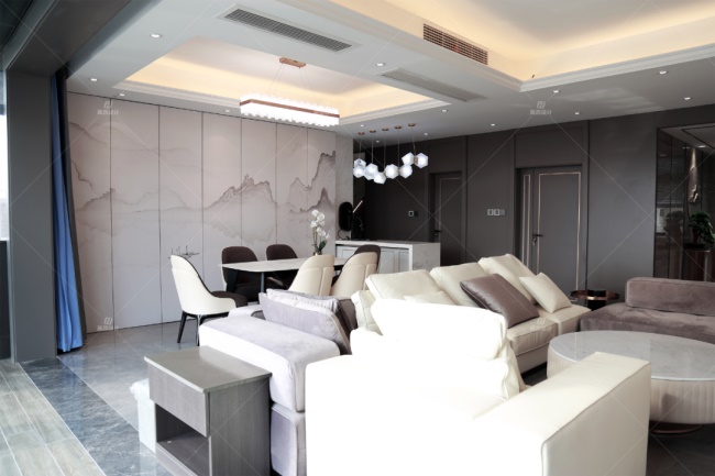 滟滟水波,春江月明??筒蛷d于潔凈的色調(diào)中牽引出層次,無(wú)主燈設(shè)計(jì),天然石材,幾何輪廓,每一隅細(xì)節(jié)的考究,都賦予了空間更美好的詮釋。