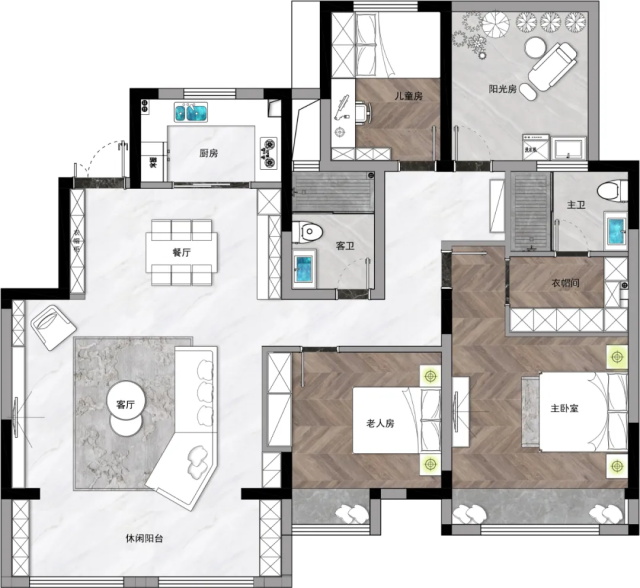 本案業(yè)主是三世同堂,老人同住,對(duì)空間的訴求就是要干凈大氣,不喜繁雜。設(shè)計(jì)師以現(xiàn)代簡(jiǎn)約風(fēng)定義空間,全房無(wú)主燈設(shè)計(jì),融入適量的輕奢元素,來(lái)塑造一個(gè)既有品位、舒適度也很高的生活空間。