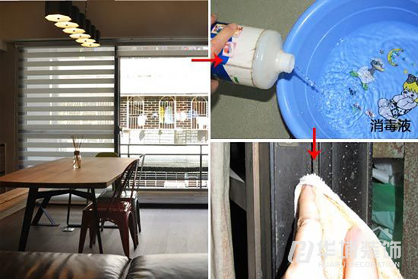 門(mén)窗清潔:門(mén)窗清潔時(shí)可以先用抹布將表面灰塵擦干凈,然后使用消毒液清潔窗戶(hù)軌道等縫隙位置。