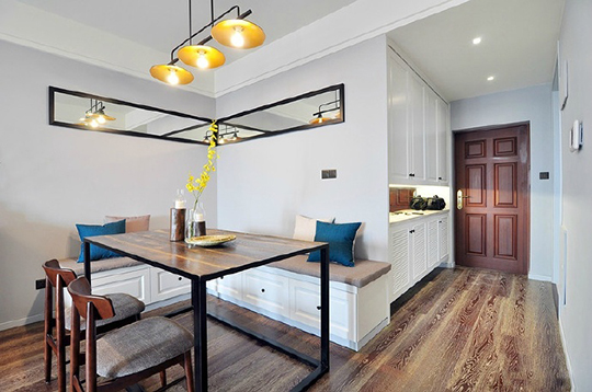 如戶玄關(guān),收納裝飾,餐廳、餐桌搭配,更喜歡的是餐桌上方的吊燈裝飾。
