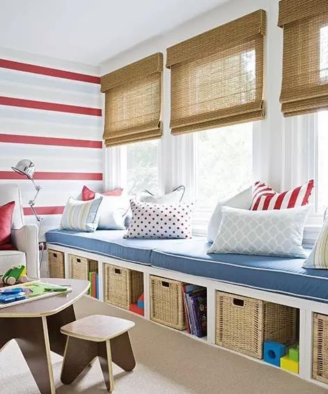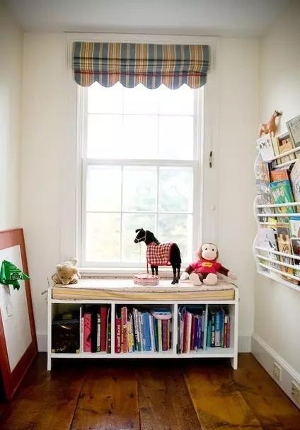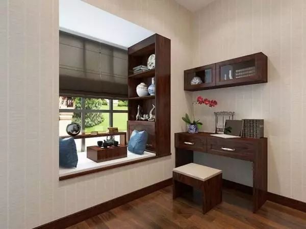 3、在側(cè)墻做柜體。用木地板做臺面,鋪墊子。優(yōu)點是施工方便,整體顏色和臥室比較搭配,飄窗處還可以做小憩的空間。