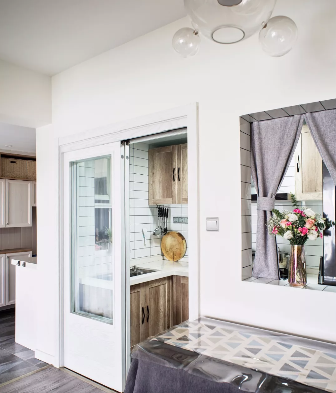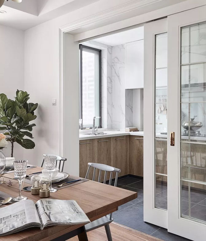 推拉門靈活隔開兩個空間,沒有了傳統(tǒng)木門的厚重與封閉,更顯時尚與透亮。餐廳與廚房隔而不斷,還能有效地防止油煙。