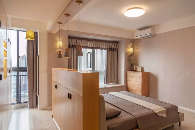 作為一種軟隔斷,色澤漂亮的簾幕可將臥室分割成幾個不同機能的小空間。如需要,布簾隔斷就可以任意開啟,是彈性隔開臥室睡眠空間和公共空間的理想形式。