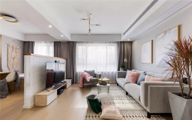 電視墻形成的隔斷時尚感十足,讓人眼前一亮。這種隔斷輕巧實用,還能節(jié)約客廳面積。