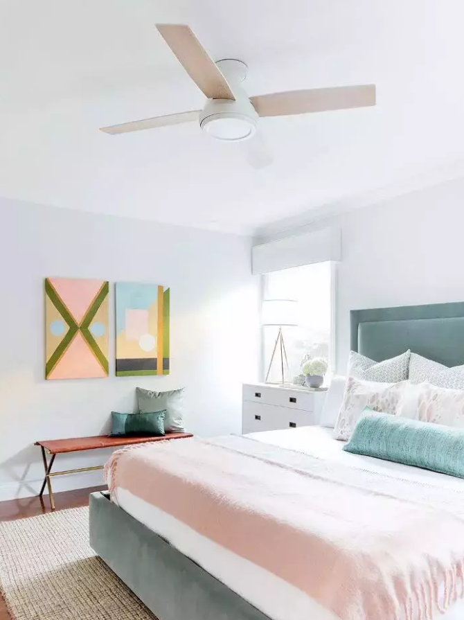 我們會找任何借口在房間里刷上一抹腮紅,因?yàn)椴还茉谌魏慰臻g,彩粉都是迎接春光的完美色調(diào)。像腮紅和藍(lán)綠色這樣的淺色調(diào)在臥室里尤其適用,它們有助于營造柔和的氣氛。