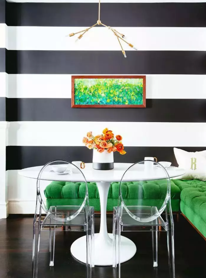 試著把條紋壁紙與花卉和綠色混合在一起,非主流更流行。這條長凳把用餐帶到了一個(gè)更高的層次,空間采用了高對比度的黑色、白色、綠色和橙色調(diào)色板。透明椅讓整個(gè)座位區(qū)感覺很輕,就像我們喜歡的春天裝飾的感覺一樣。